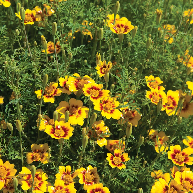 Hundreds of petite flowers cover neat, low mounds of lacy foliage with a citrusy scent. ¾-1¼” flowers are lemon yellow with a maroon star-shaped pattern in the center. Long-blooming for beds, borders and containers.