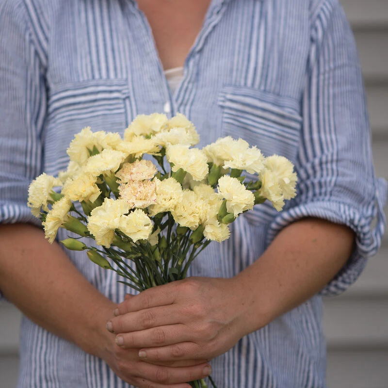 Vintage carnations present the sweet and spicy fragrance of clove. Frilly, pale lemon yellow, 1 1/2–2″ double blooms with a small percentage of singles. Grass-like, gray or blue-green foliage. Blooms late July through August in our trials and is best grown as an annual for cut-flower production. Chabaud is an old-fashioned type dating back to as early as 1904. D. caryophyllus is native to the Mediterranean, where emotional attachment to this flower first took root. Also known as annual carnation. Pronounced shab-o, with a long “o.” Tender perennial in Zones 6–8.