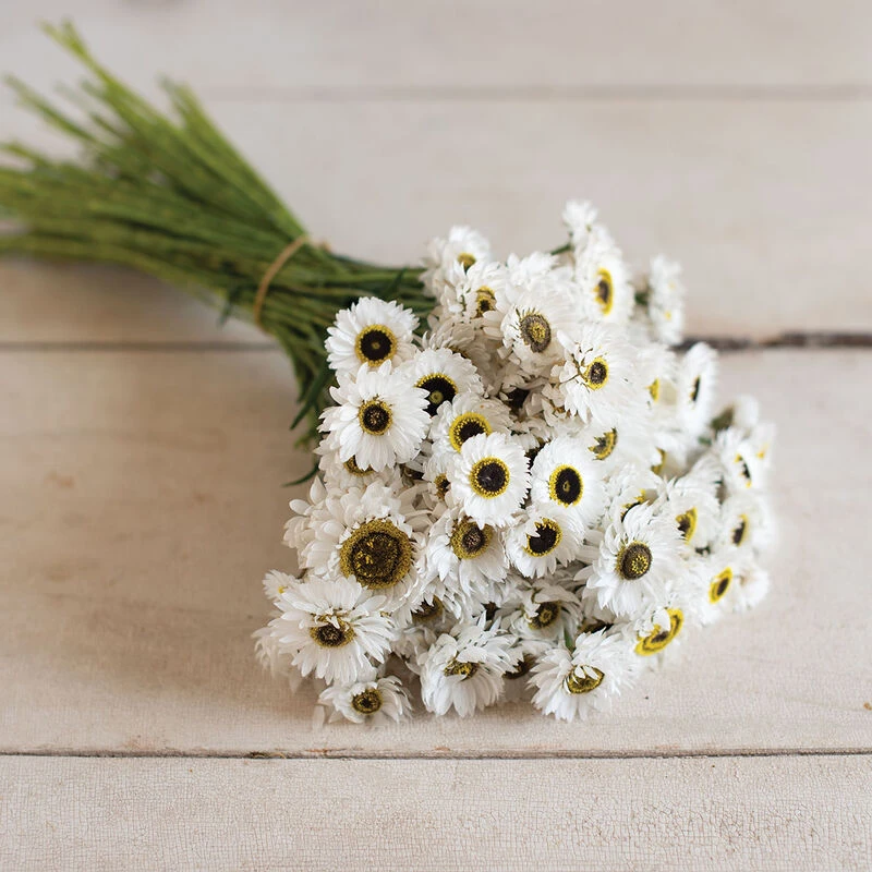 Pierrot White provides a distinctive, moody look for both cut and dried florals, though the plant stature is a bit short for cutting (approximately 18-24″). Productive plants produce relatively small, 1–2″ upward-facing, daisy-like flowers with papery petals. The flowers have a long vase life and also make excellent dried flowers. Plants are basal branching, which makes the thin, wiry stems easy to cut and strip. Helipterum is also known as Acroclinium, immortelle, paper daisy, Australian everlasting, and everlasting daisy.
