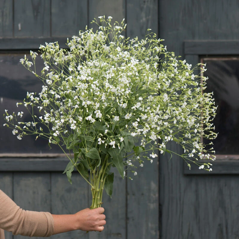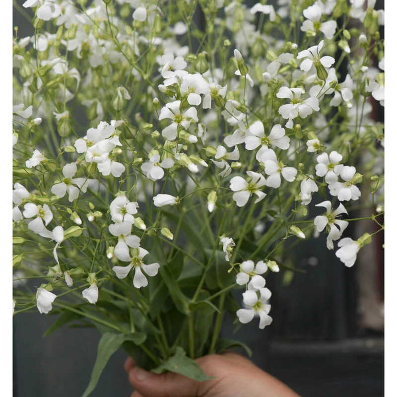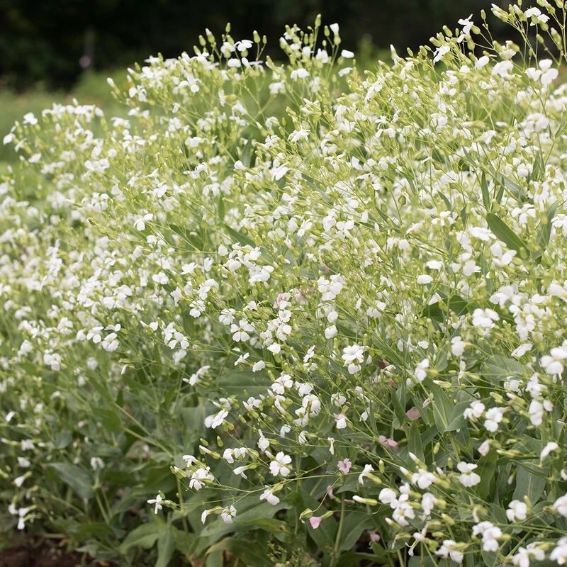 Sturdy and easy to grow. Stems are thicker, stronger, taller, and easier to manage than those of annual gypsophila, an otherwise similar flower. 3/4 to 1″ pure white blooms float above gray-blue, waxy foliage. Branching plant habit. Also known as soapwort or cow soapwort.